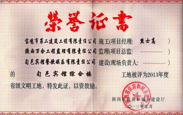 2013年省級文明工地(旬邑賓館綜合樓)