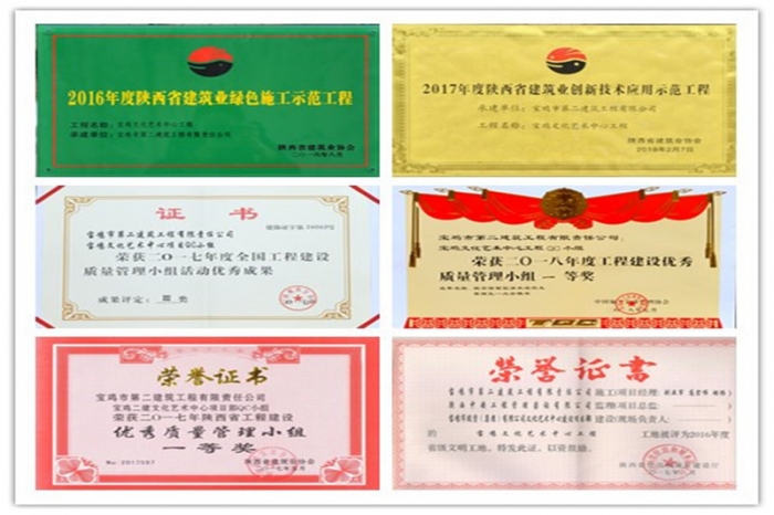 艱難困苦,玉汝于成。通過項(xiàng)目團(tuán)隊(duì)全體員工的共同努力,寶雞文化藝術(shù)中心項(xiàng)目先后被評(píng)為“2016年度寶雞市優(yōu)質(zhì)樣板主體工程”“2016年度陜西省建筑業(yè)綠色施工示范工程”“2016年度陜西省省級(jí)文明工地”“2017年度陜西省建筑業(yè)創(chuàng)新技術(shù)應(yīng)用示范工程”“2017年度陜西省建筑業(yè)優(yōu)質(zhì)結(jié)構(gòu)工程”;項(xiàng)目部先后榮獲全國工程建設(shè)質(zhì)量管理小組活動(dòng)成果獎(jiǎng)4項(xiàng)、陜西省工程建設(shè)優(yōu)秀QC小組成果獎(jiǎng)7項(xiàng),申報(bào)陜西省省級(jí)工法1項(xiàng);項(xiàng)目部先后榮獲公司先進(jìn)黨支部、先進(jìn)單位、經(jīng)濟(jì)貢獻(xiàn)特別獎(jiǎng)單位、“安康杯”安全文化知識(shí)競賽活動(dòng)二等獎(jiǎng),規(guī)劃局系統(tǒng)先進(jìn)黨支部等榮譽(yù)。
